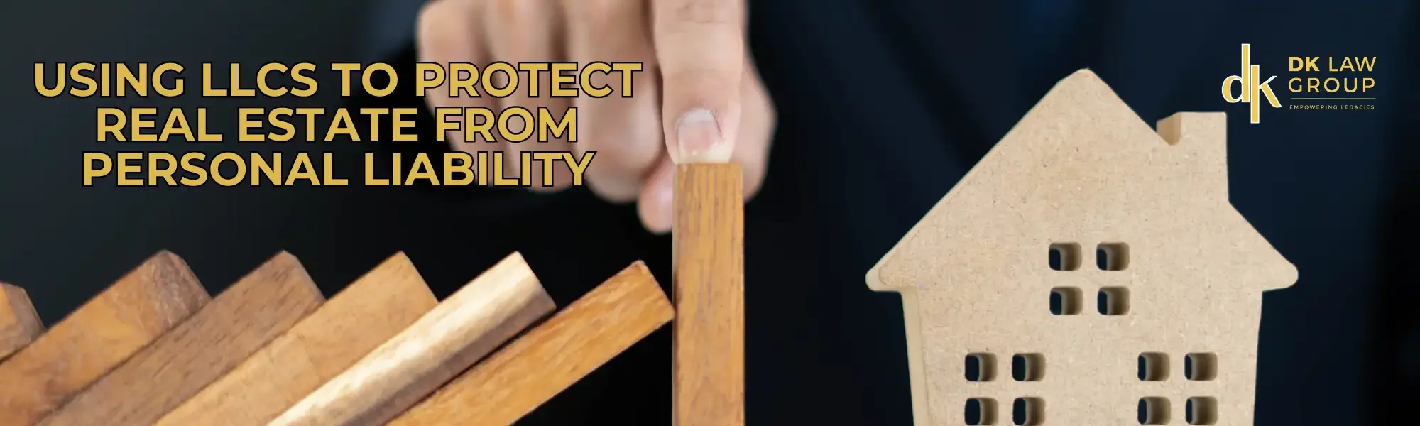 DK Law Group banner showing a hand stopping falling wooden blocks from hitting a model house, symbolizing shielding property from personal liability.