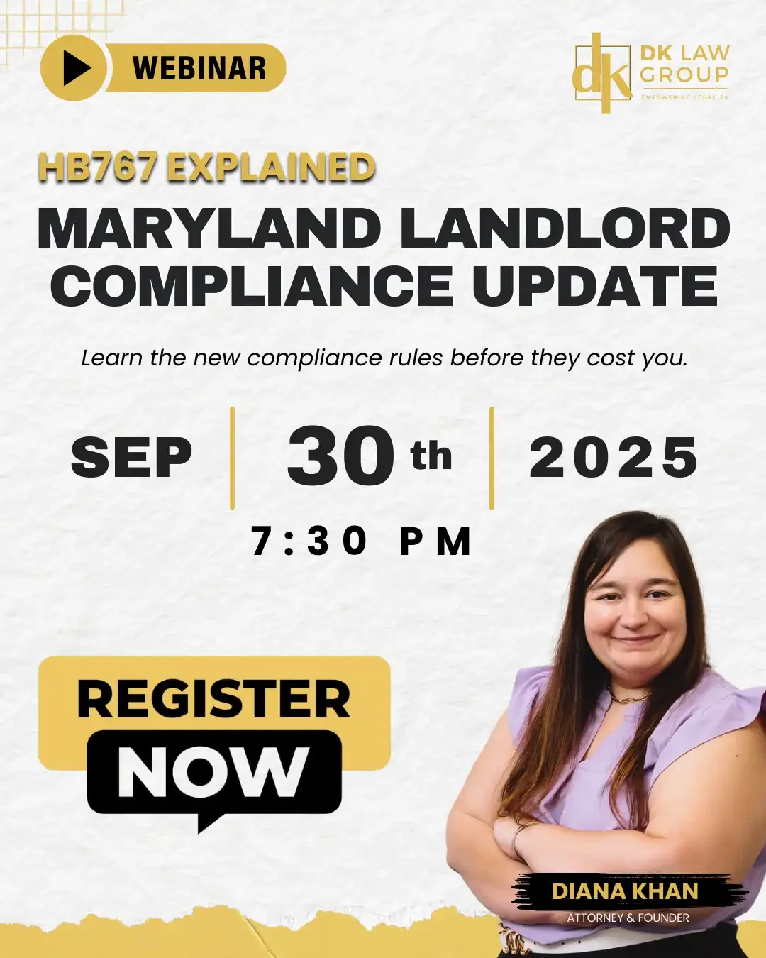 Starting October 1, 2025, Maryland House Bill 767 will reshape eviction procedures. Join attorney Diana Khan of DK Law Group for a live online legal briefing to learn new notice requirements, 10-day tenant property rules, sheriff procedures, and 60-day warrant deadlines. Designed for landlords, property managers, and real estate investors, this session will help you stay compliant and protect your rental business.